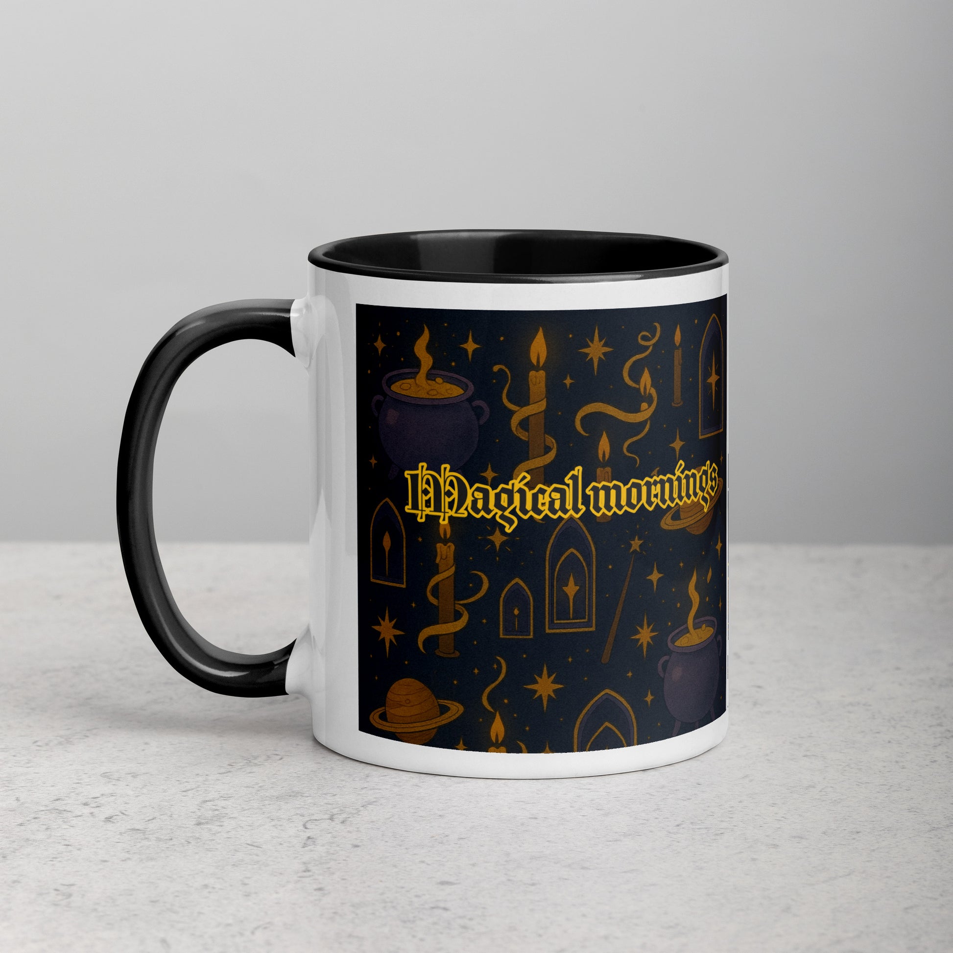This sturdy White Ceramic Mug has a colorful inside and is printed all around the mug. Choose magic every morning! Ceramic. 11 oz mug dimensions: 3. 79″ (9. 6 cm) in height, 3. 25″ (8. 3 cm) in diameter. Lead and BPA-free material. . White print area. Colored rim, inside, and handle. Dishwasher and microwave safe. Disclaimer: This product is not suitable for children under 18 months. Depending on the light setting, the handle color of the White Ceramic Mug in Black may appear blue.